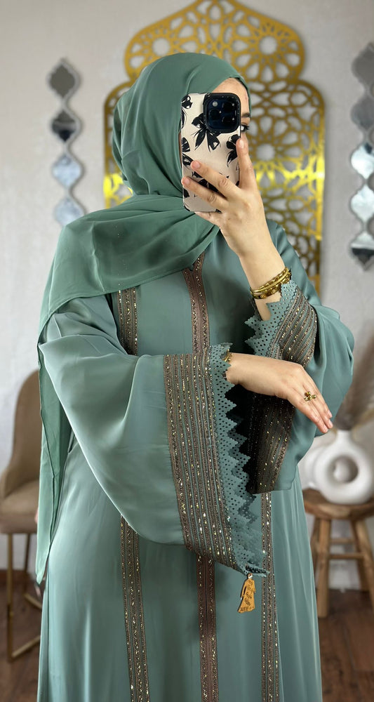 Elegante Mintgrune Abaya mit floraler stickerei
